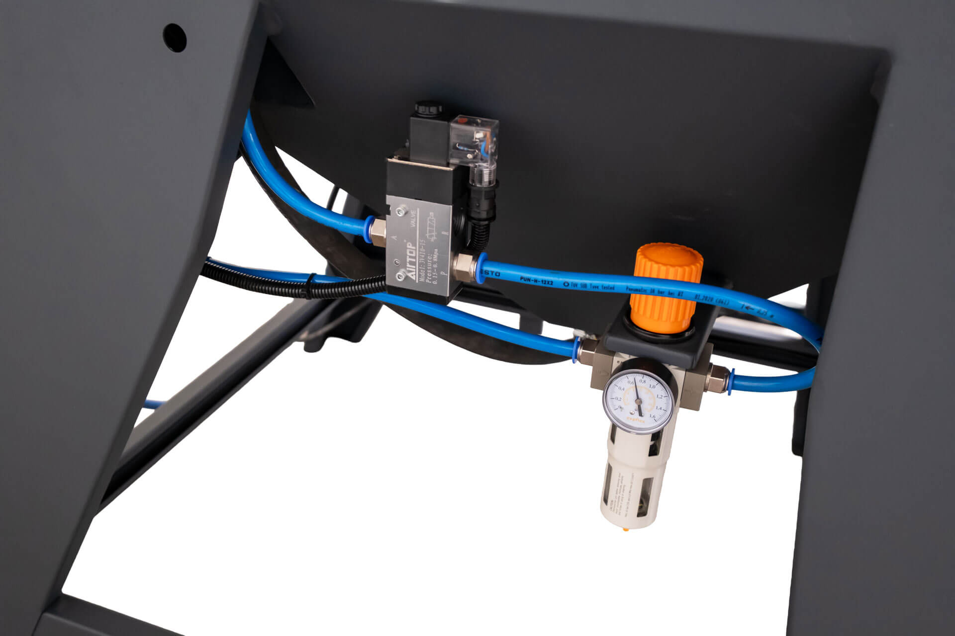 StormyBLAST A1000, metal yüzeylerdeki pas, boya ve kirleri etkili şekilde temizleyen yüksek performanslı kumlama tabancası ile öne çıkar. Bu işlem, parçaların kaplama veya boyamaya hazırlanması için ideal bir yüzey temizliği sağlar. Makinede bulunan basınç ayar vanası ve manometre, farklı malzemelere göre kumlama şiddetinin hassas biçimde ayarlanmasına imkân tanır. Böylece hem verimli hem de güvenli bir çalışma ortamı elde edilir.